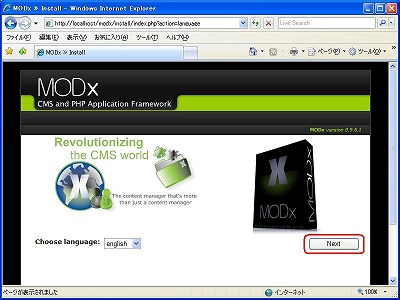 セットアップウィザードが表示されるので、「Choose language 」 が english になっていることを確認して、「Next」 をクリックする。