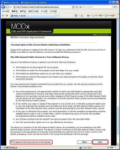 使用許諾が表示されるので、「I agree ~」 にチェックをつけて 「Next」 をクリックする。 |