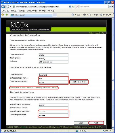 「Database login name」 「Database password」 など入力した情報で正しくデータベースにアクセスできることを確認するために、「Test connection」 をクリックする。 「Administrator username」 にMODx の管理者名を、 「Administrator password」 に管理者のパスワードを、「Confirm password」 に確認用に同じパスワードを入力して 「Next」 をクリックする。 |