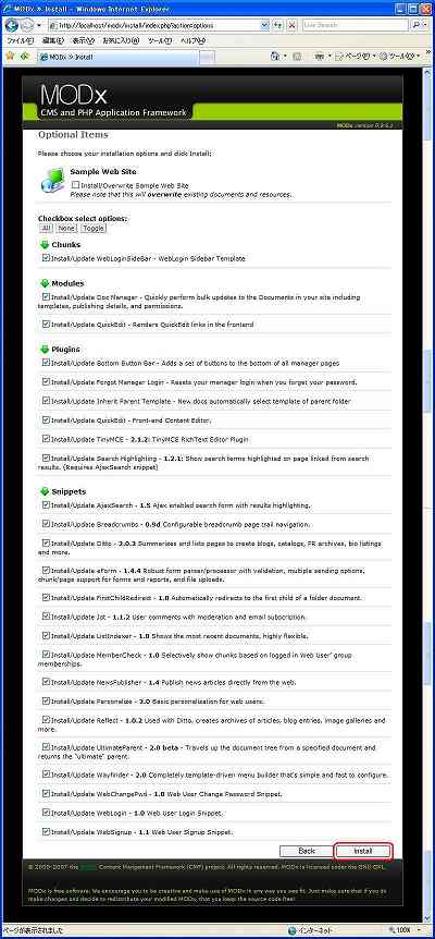 インストールオプションを確認する。 そのままで特に問題ないが、サンプルをインストールする場合は、「Sample Web Site」 にチェックをつける。 確認したら、「Next」 をクリックする。 |