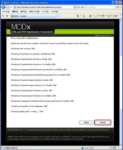 これまでの設定に問題が無いか確認する。 OK が表示されている項目は問題ないが、NG が表示されている項目は再確認、設定の変更が必要。 問題が無ければ、「Install」 をクリックする。 |