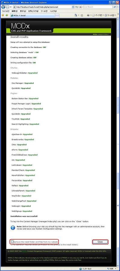各項目が OK や Upgraded なら問題なし。 最後に Instalation was successfull が表示されれば、インストール成功。 セキュリティの確保のためにインストールウィザードが置かれているフォルダ(install) を削除するべきだが、プログラムからの削除はうまくできない場合があるので、「Remove the install folder and ~」 のチェックを外して 「Close」 をクリックする。 |