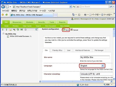 システム設定 (System configuration) 画面が表示されるます。 「Language」 を Japanese に変更して、「Save」 をクリックする。 |