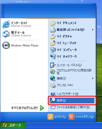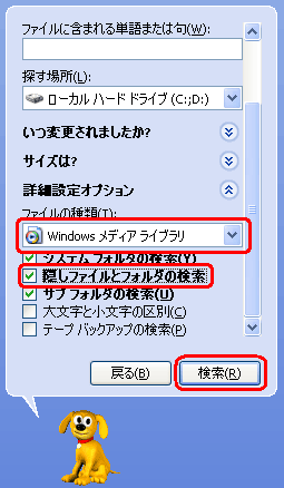 [ファイルの種類] ボックスの一覧から [Windows メディアライブラリ] を選択し、[隠しファイルとフォルダの検索] チェックボックスにチェックをつける。 ここまでの設定が確認できたら、[検索] をクリックする。 |