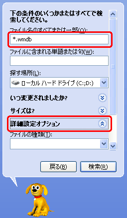 [ファイル名のすべてまたは一部] に 「*.wmdb」 と入力し、[詳細設定オプション] をクリックする。 |