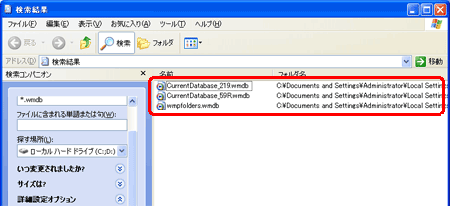 いくつかのファイルが見つかるので、そのうち [フォルダ名] が C:\Documents and Settings\ユーザー名\Local Settings\Application Data\Microsoft\Media Player (サンプルでは、ユーザー名は 「Administrator」) となっているファイルを選択し、他のフォルダ (デスクトップなど) へ移動するか、削除する。 |