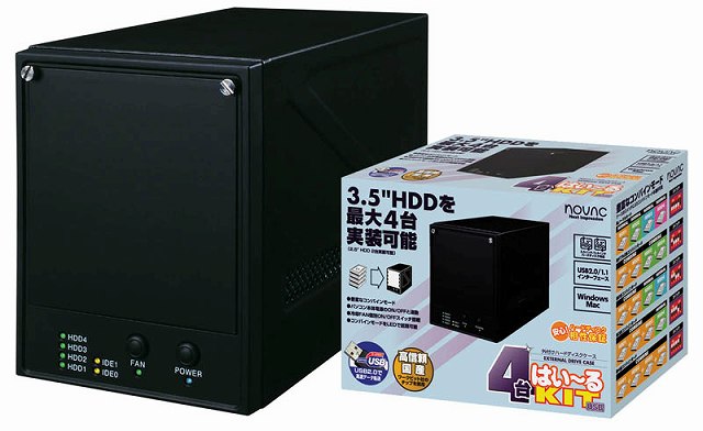 買っちゃいました、novac 社製 HDD ケース『 4台はい~る Kit USB 』。 こいつは、小さなケースのクセに HDD を 4 台搭載可能なんです。 また、(最悪の事態に覚悟があるなら)複数台 の HDD を連結して大容量の HDD として使う ことも可能です。 事前にいろいろなところで製品の情報を調べたところ、製品のバラツキが ひどくて初期不良率も高いようなことが言われていたので他社の同等製品と 悩んでいたんですが、というか、そもそもそこまで HDD が必要なのかなど 考えていたんですが、某通販ショップが 『 週末限定 送料無料 』 なんて キャンペーンをしていたので買っちゃいました。 使った具合は・・・いや~、良い(^^) とりあえず初期不良も無かったし、データ転送もそれなりの速度で行えるし、 データ転送時のエラーも出ないし、ファンばついているのに音が静かだし。 \13,000 という値段は若干高いかなと思ってたけど、外付けケースを 4 台買うと同じくらいになるし、電源がタコ足になったり、USB ケーブルが トッ散らかったりすることを思うと、全然価値があるもんだと思います。 いや~、良い買い物ができました。 さ~て、あとは、日常の安定動作だな(-。-) ボソッ |