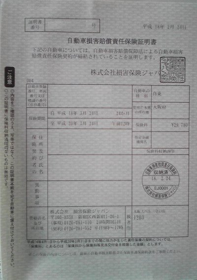 自動車損害賠償責任保険証明書 (自賠責保険証書)