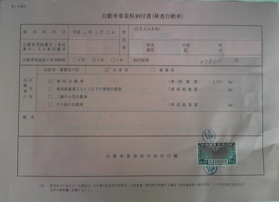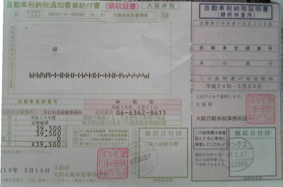 直近の春に支払った自動車税の納税書類の控えです。紛失した場合は、車検場にある自動車税事務所でも入手できます。