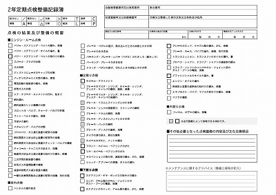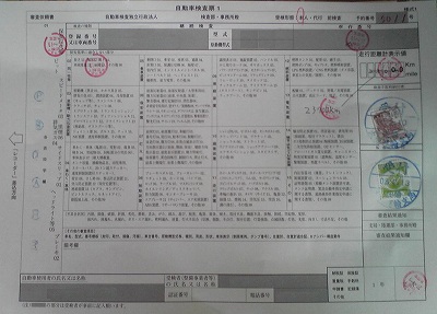 車両の点検内容を記載する用紙。前検査の場合は検査内容を記載して提出。後検査の場合は、その旨を検査官に告げて白紙で提出。