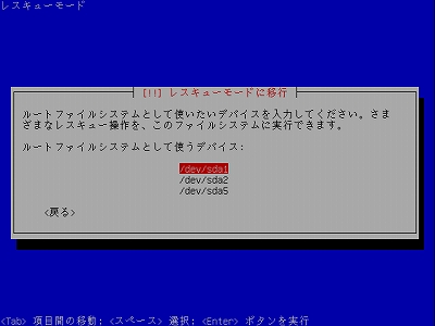 5) レスキューモードに移行 で、ルートファイルシステムとして使うデバイスを選択する