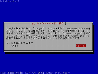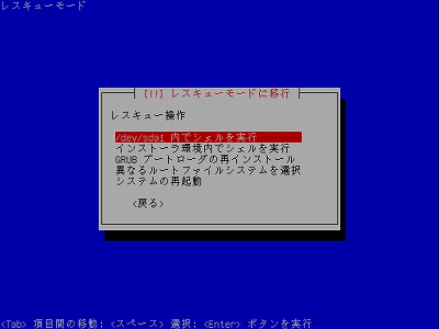 6) レスキュー操作 で、インストーラ環境内でシェルを実行 を選択する